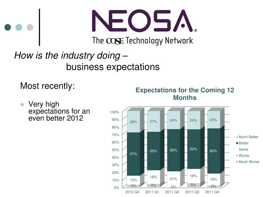 Most recently: • Very high expectations for an even better 2012 How is the industry doing – business expectations