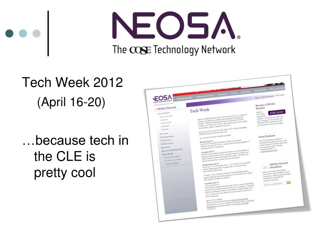 2012 and more… • Events/Podcasts • Advocacy • Third Frontier • R.I.T.E. • Tech education in the CLE • Tech Week 2011, 2012 • And beyond…