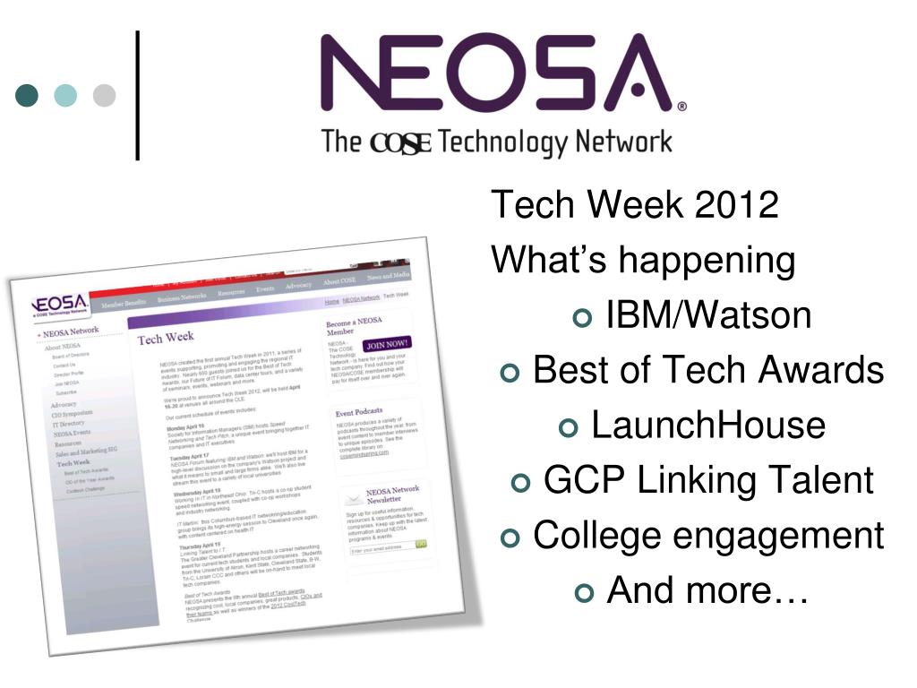 Tech Week 2012 What’s happening • IBM/Watson • Best of Tech Awards • LaunchHouse • GCP Linking Talent • College engagement • And more…