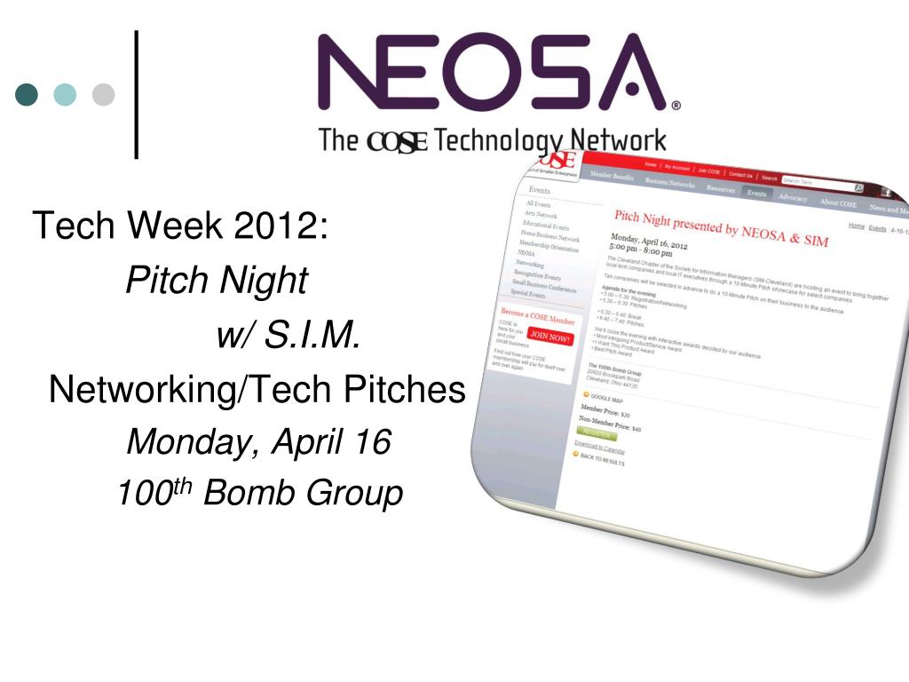 Tech Week 2012: Pitch Night w/ S.I.M. Networking/Tech Pitches Monday, April 16 100th Bomb Group