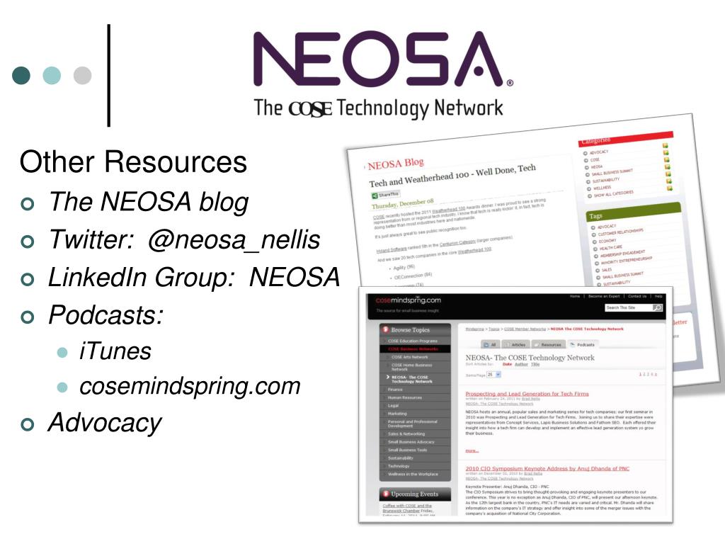 Other Resources • The NEOSA blog • Twitter: @neosa_nellis • LinkedIn Group: NEOSA • Podcasts: • iTunes • cosemindspring.com • Advocacy