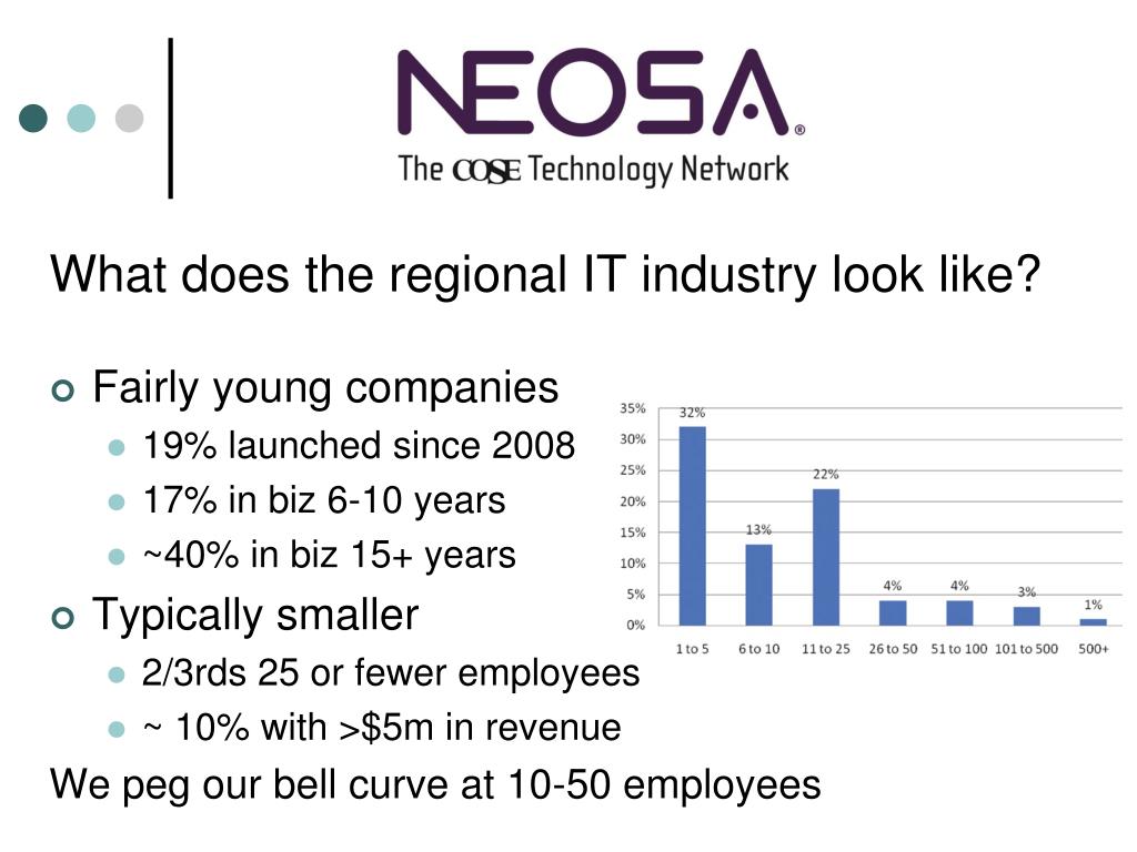 What does the regional IT industry look like? • Fairly young companies • 19% launched since 2008 • 17% in biz 6-10 years • ~40% in biz 15+ years • Typically smaller • 2/3rds 25 or fewer employees • ~ 10% with >$5m in revenue We peg our bell curve at 10-50 employees
