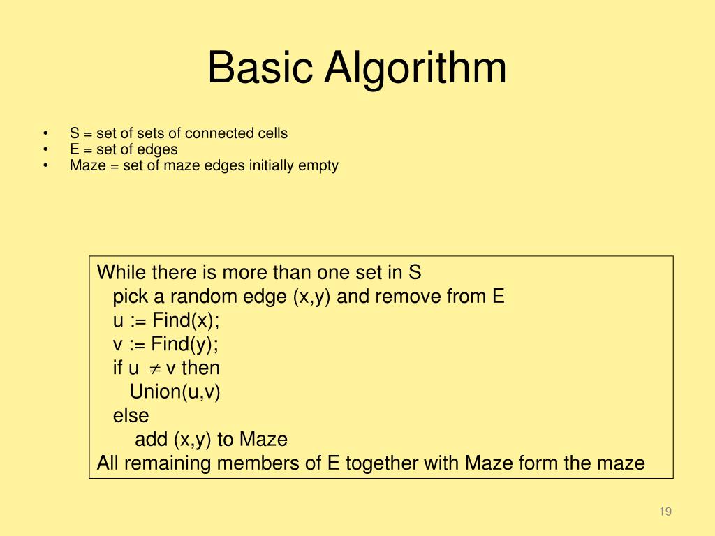 Basic Algorithm • S = set of sets of connected cells • E = set of edges • Maze = set of maze edges initially empty While there is more than one set in S pick a random edge (x,y) and remove from E u := Find(x); v := Find(y); if u v then Union(u,v) else add (x,y) to Maze All remaining members of E together with Maze form the maze