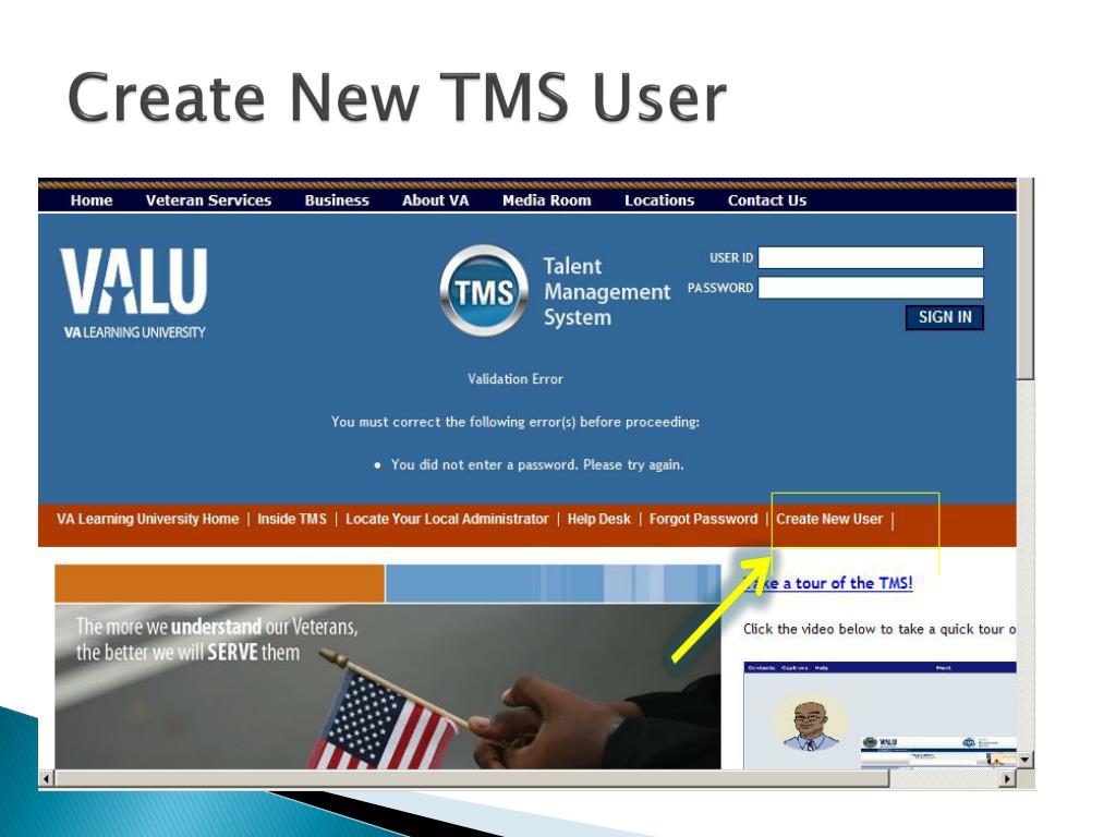 Directions for mandatory Security and Privacy Competency Modules • Access both mandatory modules from this website: • Go to https://www.tms.va.gov and click on the “Create New User” link on the TMS to gain access.