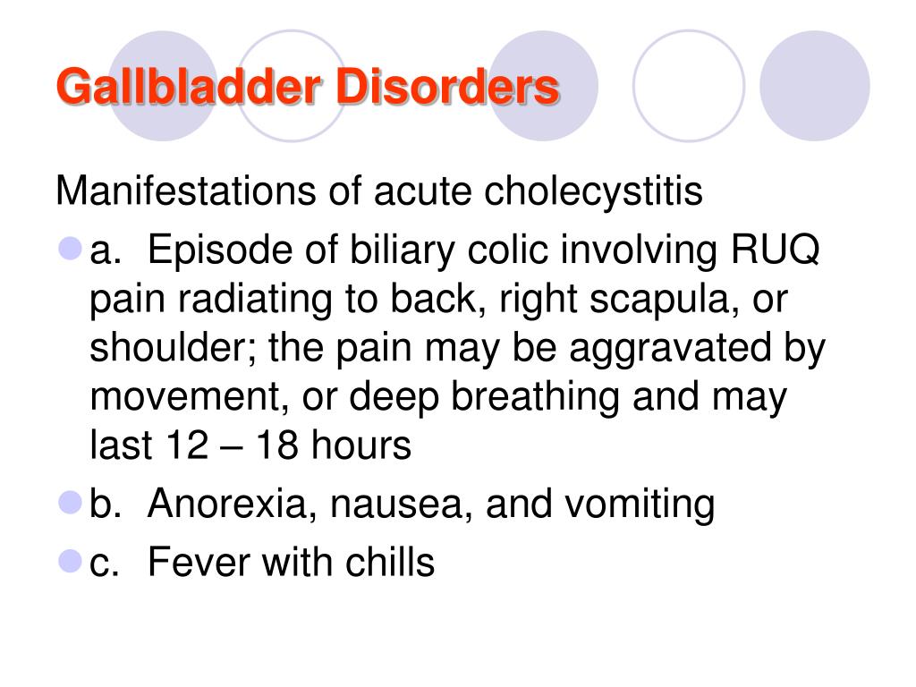 Gallbladder Disorders Manifestations of acute cholecystitis • a. Episode of biliary colic involving RUQ pain radiating to back, right scapula, or shoulder; the pain may be aggravated by movement, or deep breathing and may last 12 – 18 hours • b. Anorexia, nausea, and vomiting • c. Fever with chills