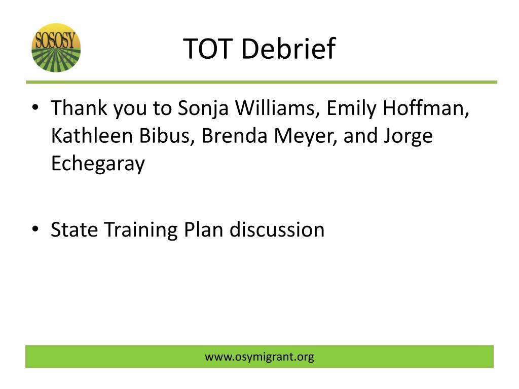 TOT Debrief • Thank you to Sonja Williams, Emily Hoffman, Kathleen Bibus, Brenda Meyer, and Jorge Echegaray • State Training Plan discussion www.osymigrant.org