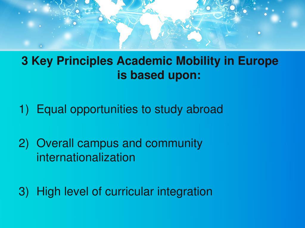 3 Key Principles Academic Mobility in Europe is based upon: • Equal opportunities to study abroad • Overall campus and community internationalization • High level of curricular integration
