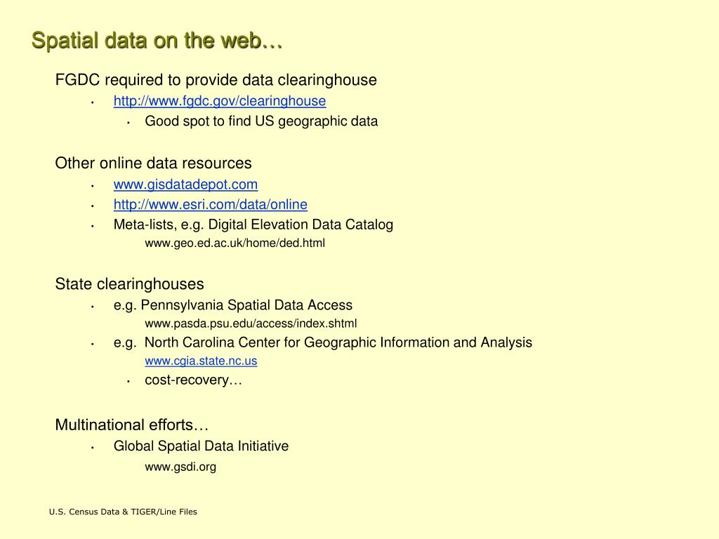 Spatial data on the web… • FGDC required to provide data clearinghouse • http://www.fgdc.gov/clearinghouse • Good spot to find US geographic data • Other online data resources • www.gisdatadepot.com • http://www.esri.com/data/online • Meta-lists, e.g. Digital Elevation Data Catalog www.geo.ed.ac.uk/home/ded.html • State clearinghouses • e.g. Pennsylvania Spatial Data Access www.pasda.psu.edu/access/index.shtml • e.g. North Carolina Center for Geographic Information and Analysis www.cgia.state.nc.us • cost-recovery… • Multinational efforts… • Global Spatial Data Initiative www.gsdi.org