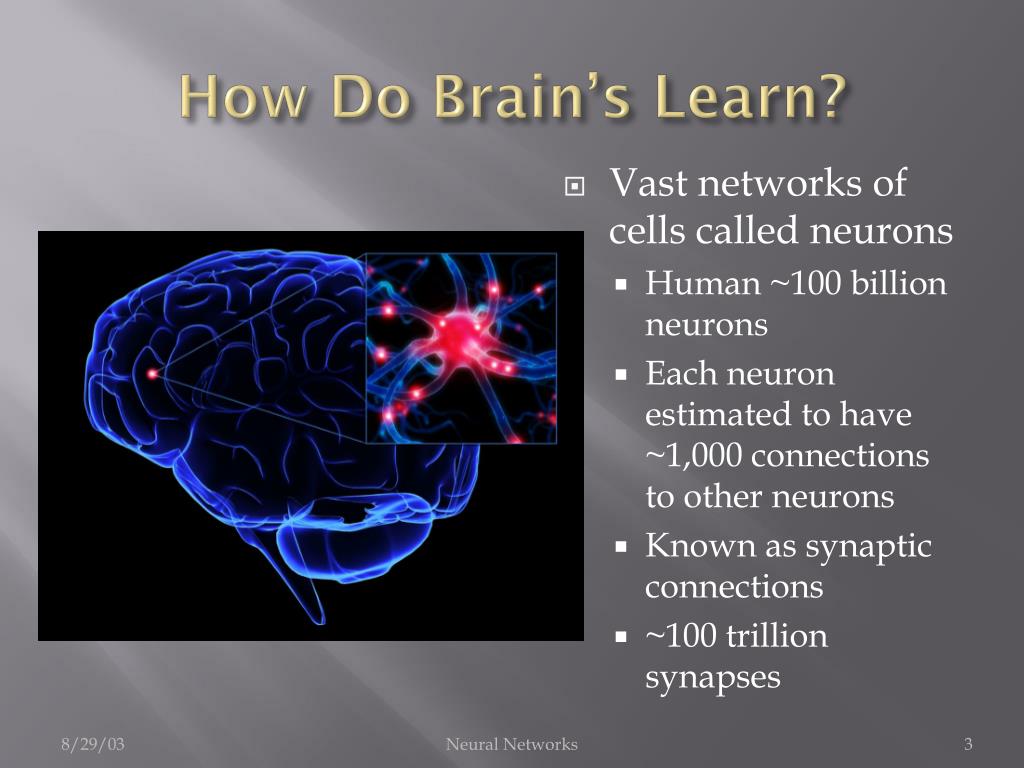 How Do Brain’s Learn? • Vast networks of cells called neurons • Human ~100 billion neurons • Each neuron estimated to have ~1,000 connections to other neurons • Known as synaptic connections • ~100 trillion synapses Neural Networks