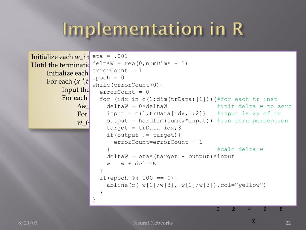 Implementation in R • Initialize each 𝑤_𝑖 to some small random value • Until the termination condition is met, DO • Initialize each ∆𝑤_𝑖 to zero • For each ⟨𝑥 ⃗,𝑡⟩ in training_examples, DO • Input the instance 𝑥 ⃗ to the unit and compute the output o • For each linear unit weight 𝑤_𝑖, DO • ∆𝑤_𝑖←𝜂(𝑡−𝑜) 𝑥_𝑖 • For each linear unit weight 𝑤_𝑖, DO • 𝑤_𝑖←𝑤_𝑖+∆𝑤_𝑖 eta = .001 deltaW = rep(0,numDims + 1) errorCount= 1 epoch = 0 while(errorCount>0){ errorCount= 0 for (idx in c(1:dim(trData)[1])){#for each trinst deltaW= 0*deltaW#init delta w to zero input = c(1,trData[idx,1:2]) #input is xy of tr output = hardlim(sum(w*input)) #run thru perceptron target = trData[idx,3] if(output != target){ errorCount=errorCount+ 1 } #calc delta w deltaW = eta*(target - output)*input w = w + deltaW } if(epoch %% 100 == 0){ abline(c(-w[1]/w[3],-w[2]/w[3]),col="yellow") } } Neural Networks