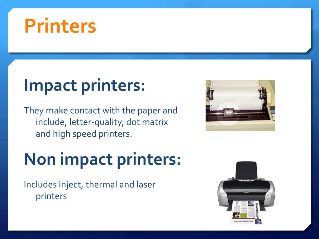Printers Impact printers: They make contact with the paper and include, letter-quality, dot matrix and high speed printers. Non impact printers: Includes inject, thermal and laser printers