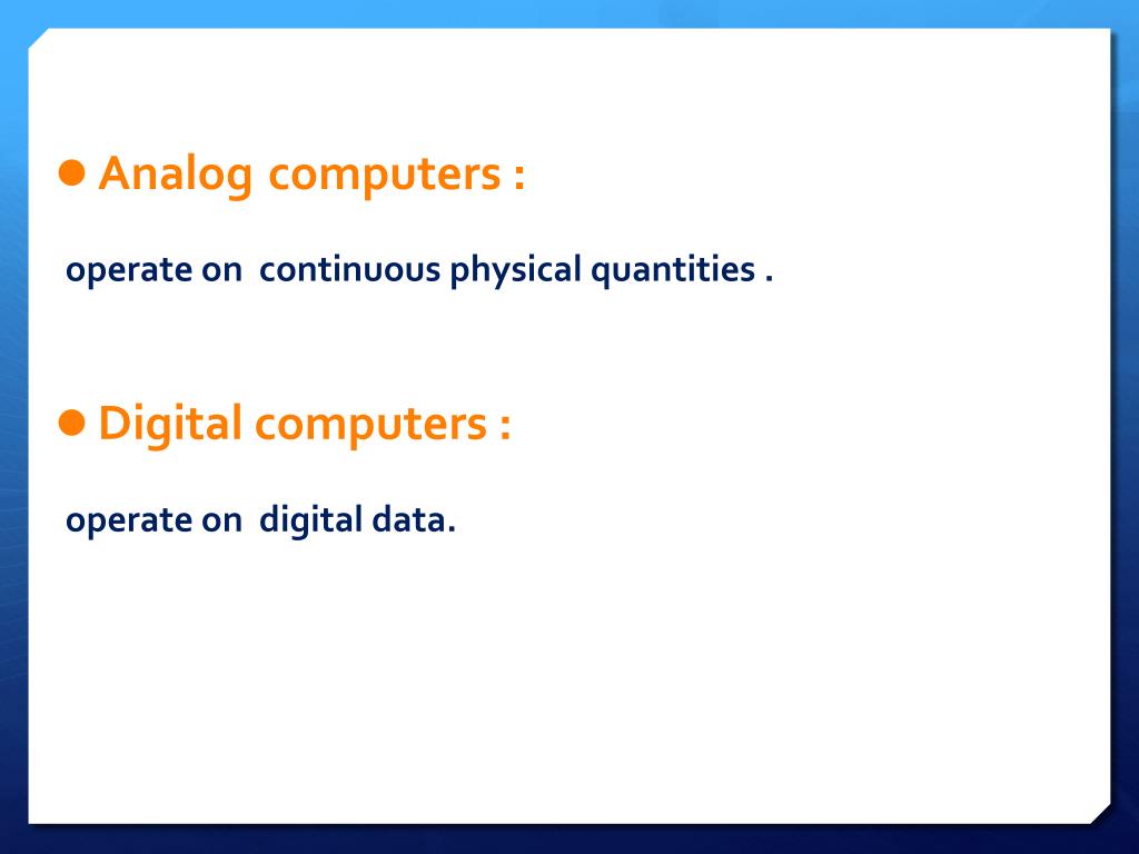 Analogcomputers : operate on continuous physical quantities . Digital computers : operate on digital data.