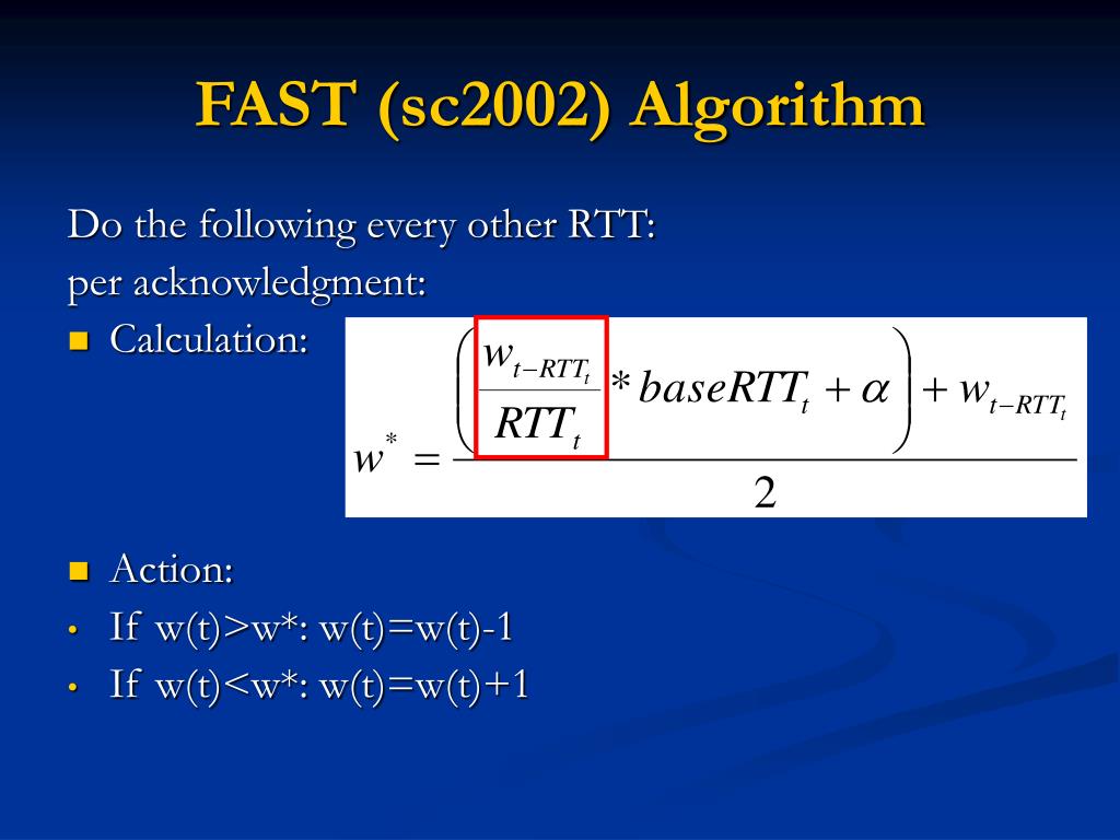 FAST (sc2002) Algorithm Do the following every other RTT: per acknowledgment: • Calculation: • Action: • If w(t)>w*: w(t)=w(t)-1 • If w(t)<w*: w(t)=w(t)+1