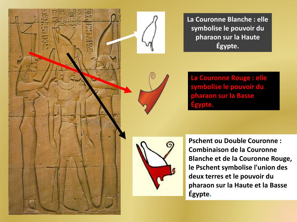 La Couronne Blanche : elle symbolise le pouvoir du pharaon sur la Haute Égypte. La Couronne Rouge : elle symbolise le pouvoir du pharaon sur la Basse Égypte. Pschent ou Double Couronne : Combinaison de la Couronne Blanche et de la Couronne Rouge, le Pschent symbolise l'union des deux terres et le pouvoir du pharaon sur la Haute et la Basse Égypte.