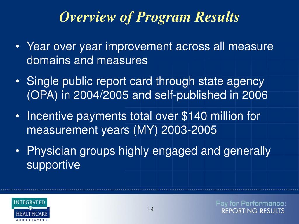 Overview of Program Results • Year over year improvement across all measure domains and measures • Single public report card through state agency (OPA) in 2004/2005 and self-published in 2006 • Incentive payments total over $140 million for measurement years (MY) 2003-2005 • Physician groups highly engaged and generally supportive
