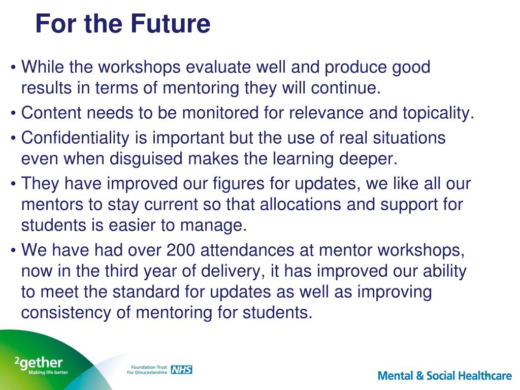 For the Future • While the workshops evaluate well and produce good results in terms of mentoring they will continue. • Content needs to be monitored for relevance and topicality. • Confidentiality is important but the use of real situations even when disguised makes the learning deeper. • They have improved our figures for updates, we like all our mentors to stay current so that allocations and support for students is easier to manage. • We have had over 200 attendances at mentor workshops, now in the third year of delivery, it has improved our ability to meet the standard for updates as well as improving consistency of mentoring for students.