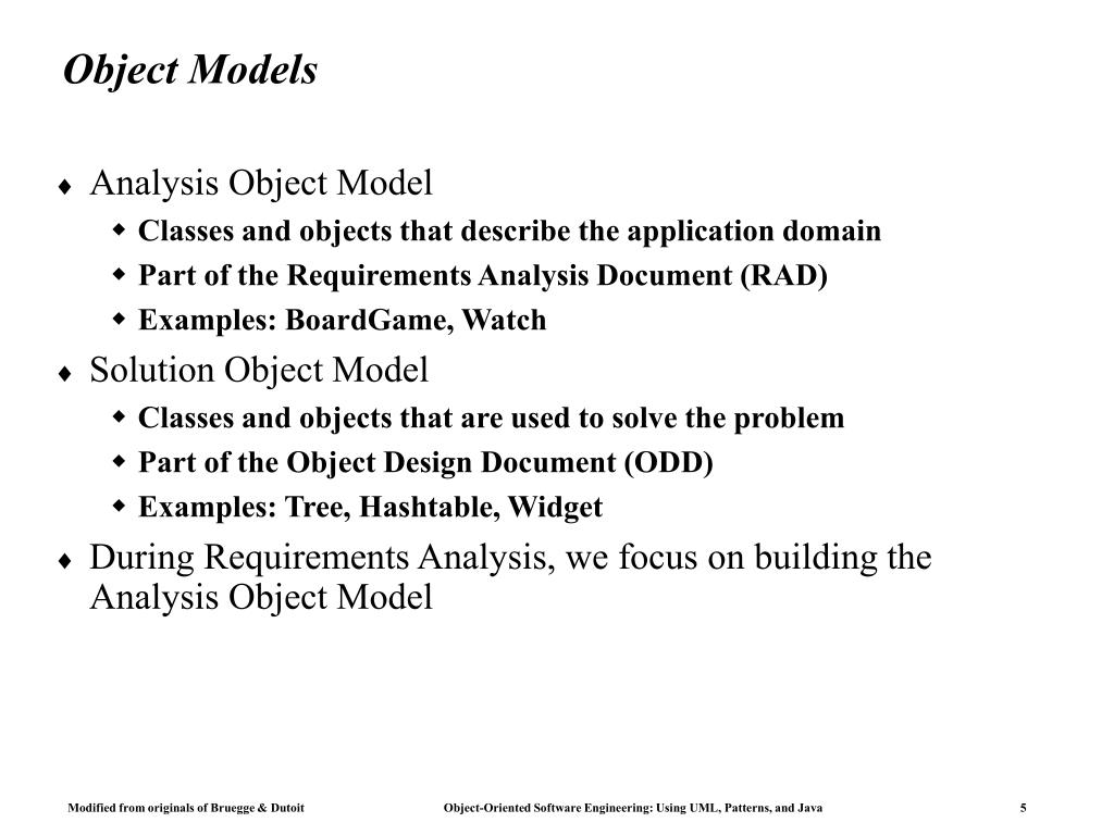 Object Models • Analysis Object Model • Classes and objects that describe the application domain • Part of the Requirements Analysis Document (RAD) • Examples: BoardGame, Watch • Solution Object Model • Classes and objects that are used to solve the problem • Part of the Object Design Document (ODD) • Examples: Tree, Hashtable, Widget • During Requirements Analysis, we focus on building the Analysis Object Model