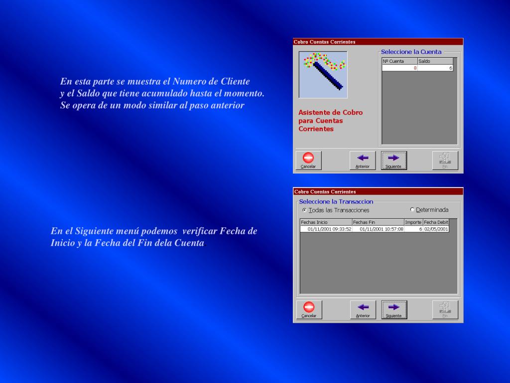 En esta parte se muestra el Numero de Cliente y el Saldo que tiene acumulado hasta el momento. Se opera de un modo similar al paso anterior En el Siguiente menú podemos verificar Fecha de Inicio y la Fecha del Fin dela Cuenta.
