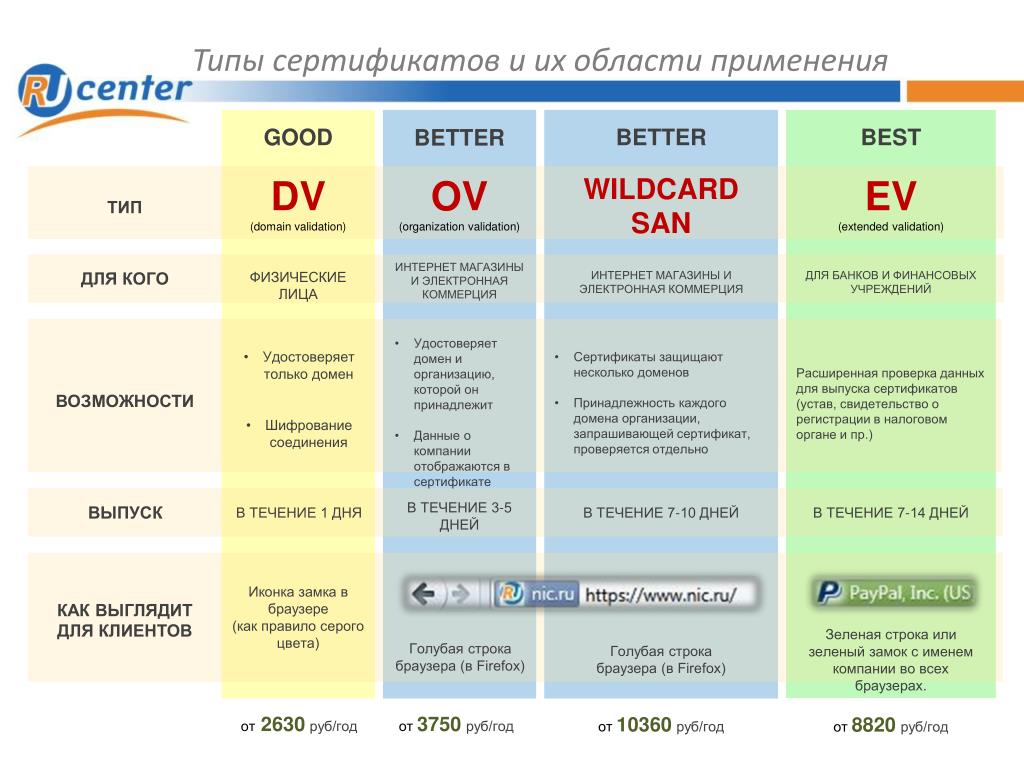 Типы сертификатов и их цены ДЛЯ ИНТЕРНЕТ-МАГАЗИНОВ И ЭЛЕКТРОННОЙ КОММЕРЦИИ Сертификаты, удостоверяющие не только домен, но и существование организации – владельца домена. RU-CENTER Gold SSL Цена: 3250руб/год RU-CENTER Platinum SSL Цена: 3750руб/год ThawteSSLWebServer Цена: 4750руб/год Comodo Gold SSL Цена: 5500руб/год ComodoPlatinumSSL SGC Цена: 7250руб/год Comodo Platinum SSL Цена: 9500руб/год