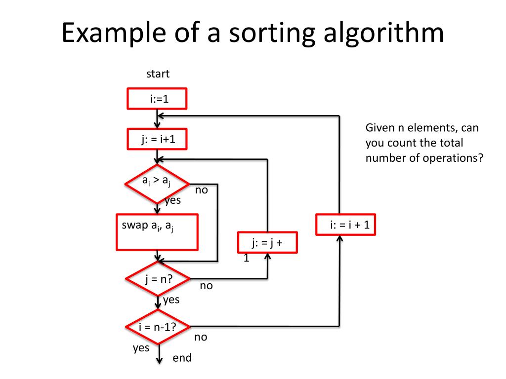 Example of a sorting algorithm start i:=1 Given n elements, can you count the total number of operations? j: = i+1 ai > aj no yes swap ai, aj i: = i + 1 j: = j + 1 j = n? no yes i = n-1? no yes end