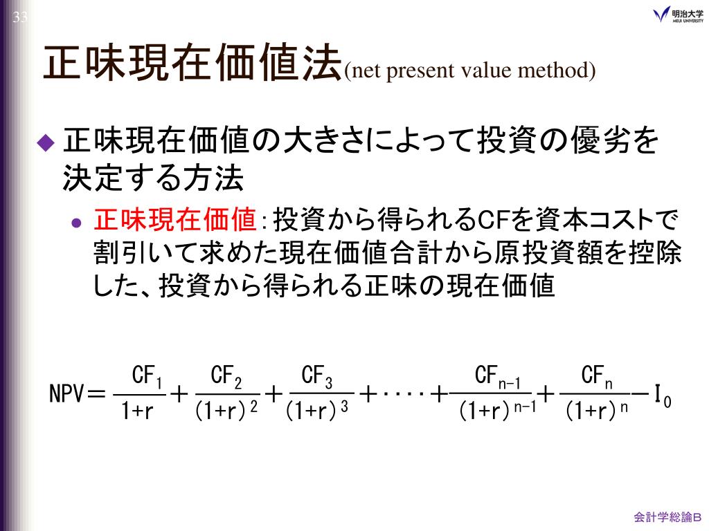 CF1CF2CF3CFn-1CFn NPV= + + +‥‥+ + -I0 1+r(1+r)2(1+r)3(1+r)n-1 (1+r)n 正味現在価値法(net present value method) • 正味現在価値の大きさによって投資の優劣を決定する方法 • 正味現在価値:投資から得られるCFを資本コストで割引いて求めた現在価値合計から原投資額を控除した、投資から得られる正味の現在価値 会計学総論B