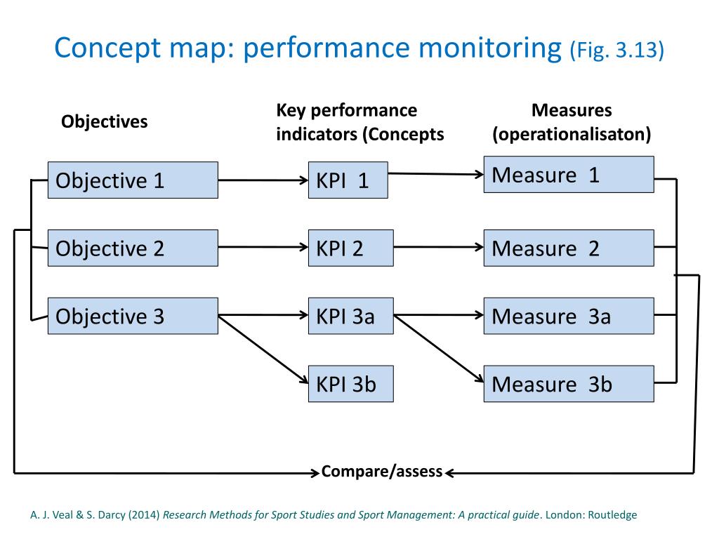 Concept map: performance monitoring (Fig. 3.13) Key performance indicators (Concepts Measures (operationalisaton) Objectives Measure 1 Objective 1 KPI 1 Objective 2 KPI 2 Measure 2 Objective 3 KPI 3a Measure 3a KPI 3b Measure 3b Compare/assess A. J. Veal & S. Darcy (2014) Research Methods for Sport Studies and Sport Management: A practical guide. London: Routledge