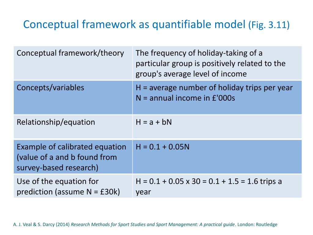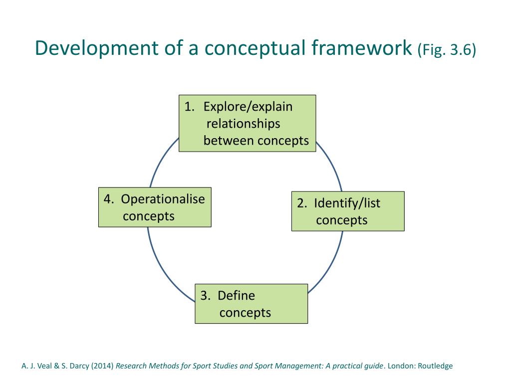 Development of a conceptual framework (Fig. 3.6) Explore/explain relationships between concepts 4. Operationaliseconcepts 2. Identify/list concepts 3. Define concepts A. J. Veal & S. Darcy (2014) Research Methods for Sport Studies and Sport Management: A practical guide. London: Routledge