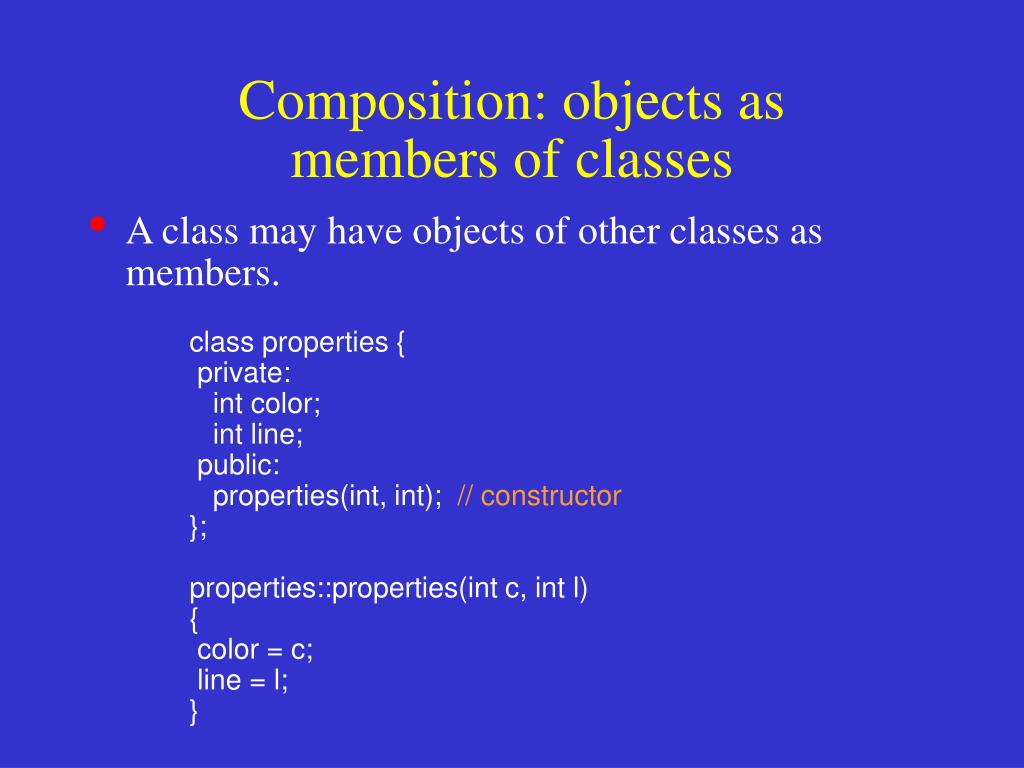 Composition: objects as members of classes • A class may have objects of other classes as members. class properties { private: int color; int line; public: properties(int, int); // constructor }; properties::properties(int c, int l) { color = c; line = l; }