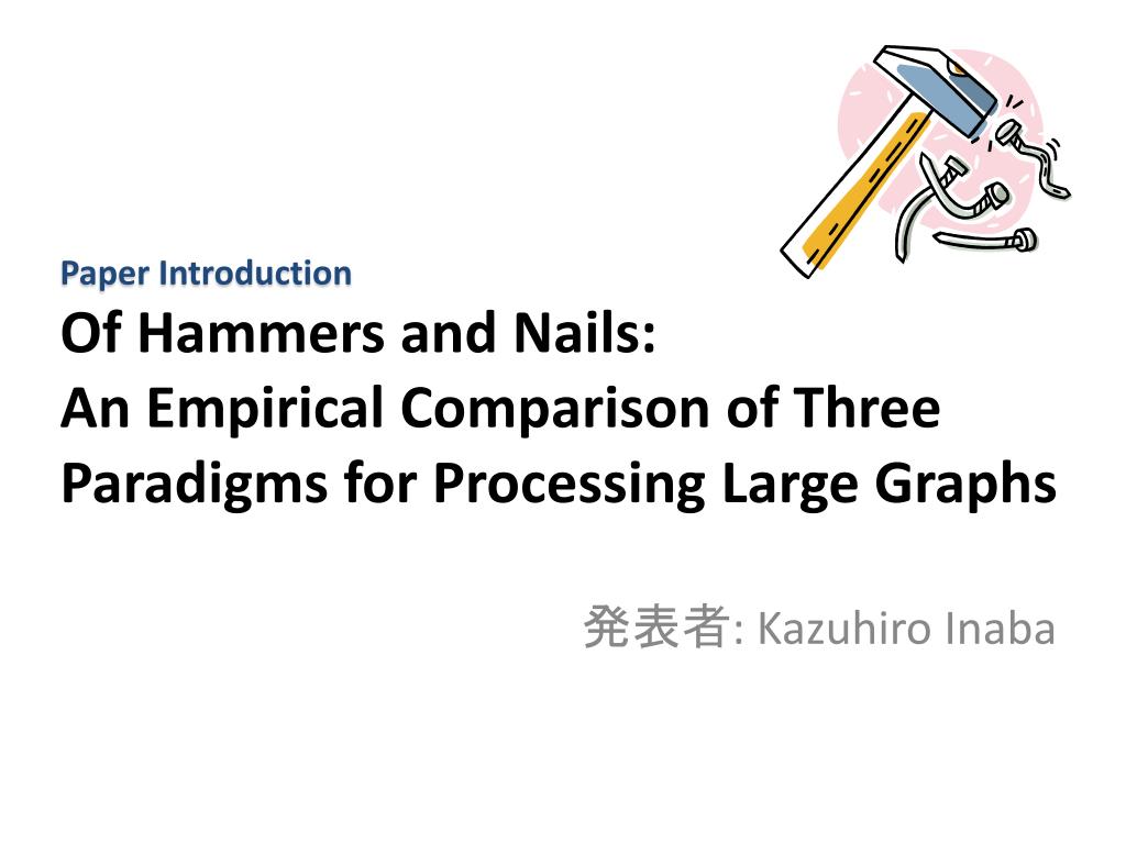 Paper Introduction Of Hammers and Nails:An Empirical Comparison of ThreeParadigms for Processing Large Graphs 発表者: Kazuhiro Inaba