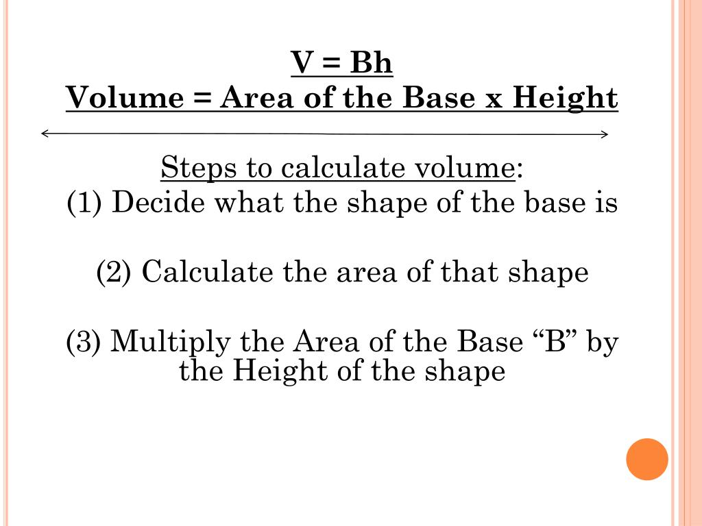 V = Bh Volume = Area of the Base x Height Steps to calculate volume: (1) Decide what the shape of the base is (2) Calculate the area of that shape (3) Multiply the Area of the Base “B” by the Height of the shape