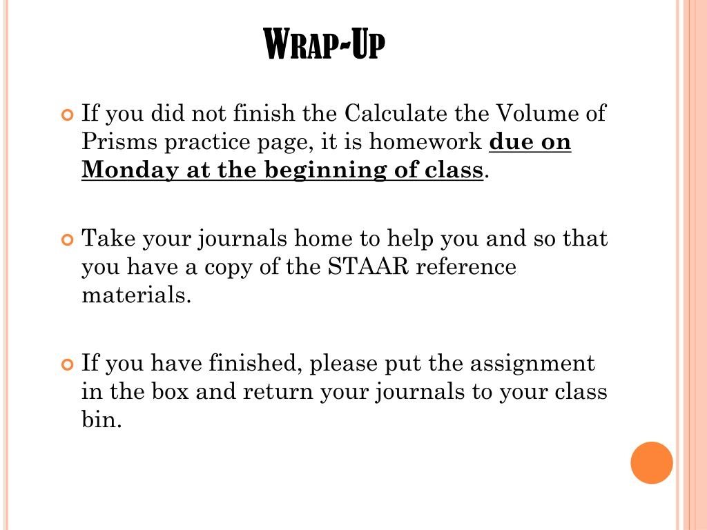 Wrap-Up • If you did not finish the Calculate the Volume of Prisms practice page, it is homework due on Monday at the beginning of class. • Take your journals home to help you and so that you have a copy of the STAAR reference materials. • If you have finished, please put the assignment in the box and return your journals to your class bin.