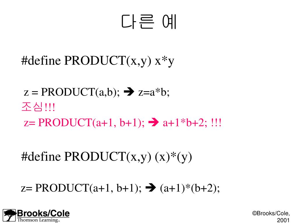 #define PRODUCT(x,y) x*y z = PRODUCT(a,b); z=a*b; 조심!!! z= PRODUCT(a+1, b+1); a+1*b+2; !!! #define PRODUCT(x,y) (x)*(y) z= PRODUCT(a+1, b+1); (a+1)*(b+2); 다른 예