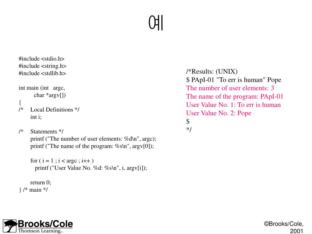 #include <stdio.h> #include <string.h> #include <stdlib.h> int main (int argc, char *argv[]) { /* Local Definitions */ int i; /* Statements */ printf ("The number of user elements: %d\n", argc); printf ("The name of the program: %s\n", argv[0]); for ( i = 1 ; i < argc ; i++ ) printf ("User Value No. %d: %s\n", i, argv[i]); return 0; } /* main */ 예 /*Results: (UNIX) $ PApI-01 "To err is human" Pope The number of user elements: 3 The name of the program: PApI-01 User Value No. 1: To err is human User Value No. 2: Pope $ */
