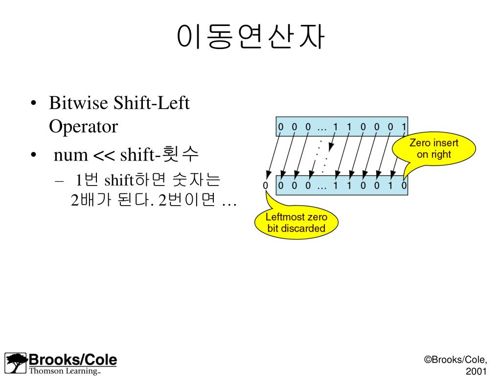 이동연산자 • Bitwise Shift-Left Operator • num << shift-횟수 • 1번 shift하면 숫자는 2배가 된다. 2번이면 …