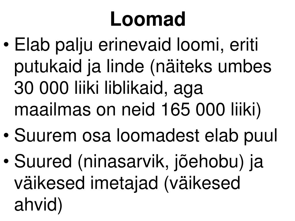 Loomad • Elab palju erinevaid loomi, eriti putukaid ja linde (näiteks umbes 30 000 liiki liblikaid, aga maailmas on neid 165 000 liiki) • Suurem osa loomadest elab puul • Suured (ninasarvik, jõehobu) ja väikesed imetajad (väikesed ahvid)