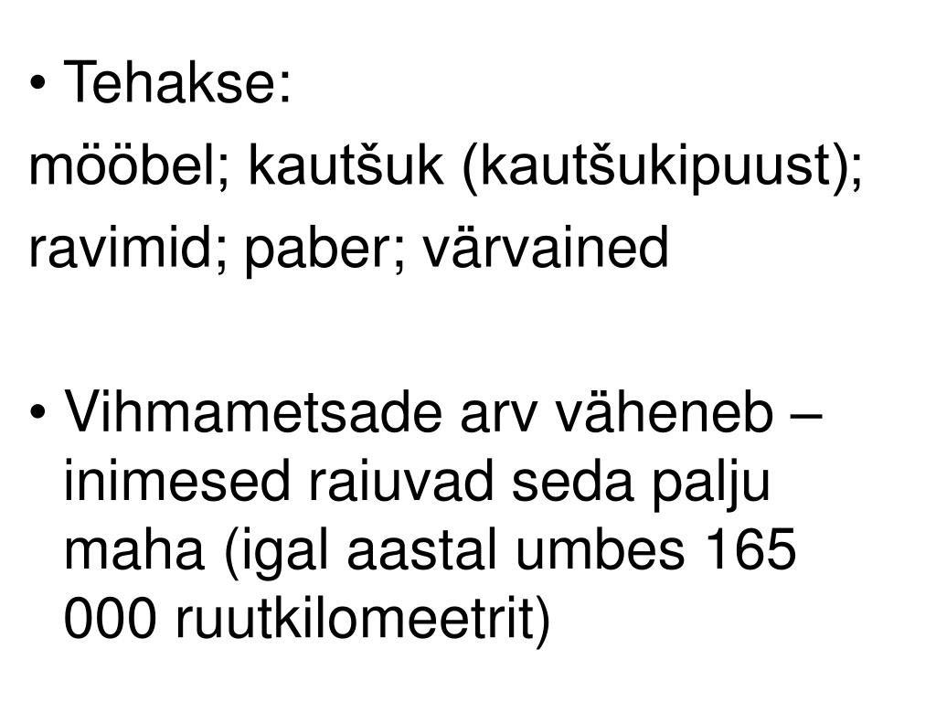 Tehakse: mööbel; kautšuk (kautšukipuust); ravimid; paber; värvained • Vihmametsade arv väheneb – inimesed raiuvad seda palju maha (igal aastal umbes 165 000 ruutkilomeetrit)