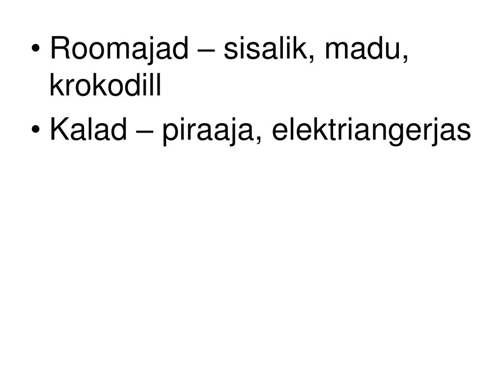Roomajad – sisalik, madu, krokodill • Kalad – piraaja, elektriangerjas
