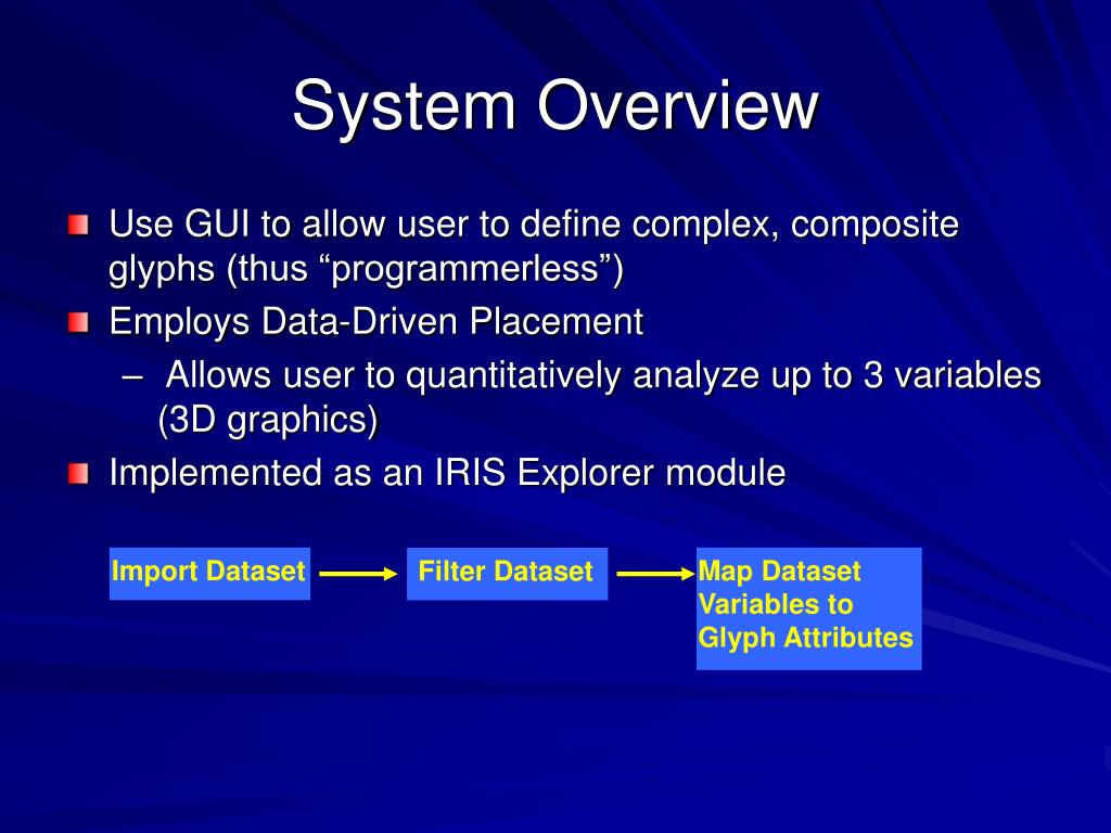 Filter Dataset Import Dataset Map Dataset Variables to Glyph Attributes System Overview • Use GUI to allow user to define complex, composite glyphs (thus “programmerless”) • Employs Data-Driven Placement • Allows user to quantitatively analyze up to 3 variables (3D graphics) • Implemented as an IRIS Explorer module