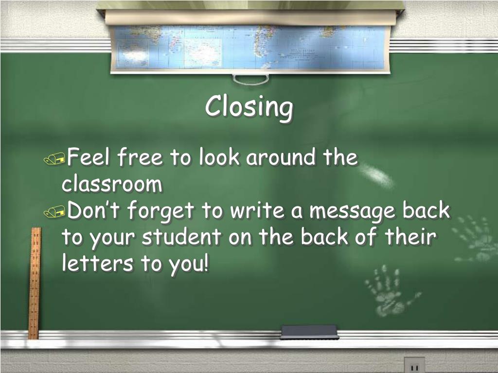 Closing • Feel free to look around the classroom • Don’t forget to write a message back to your student on the back of their letters to you!