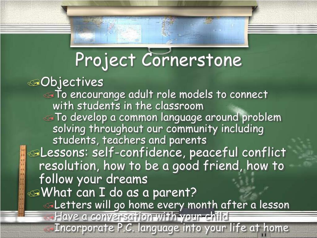 Project Cornerstone • Objectives • To encourange adult role models to connect with students in the classroom • To develop a common language around problem solving throughout our community including students, teachers and parents • Lessons: self-confidence, peaceful conflict resolution, how to be a good friend, how to follow your dreams • What can I do as a parent? • Letters will go home every month after a lesson • Have a conversation with your child • Incorporate P.C. language into your life at home