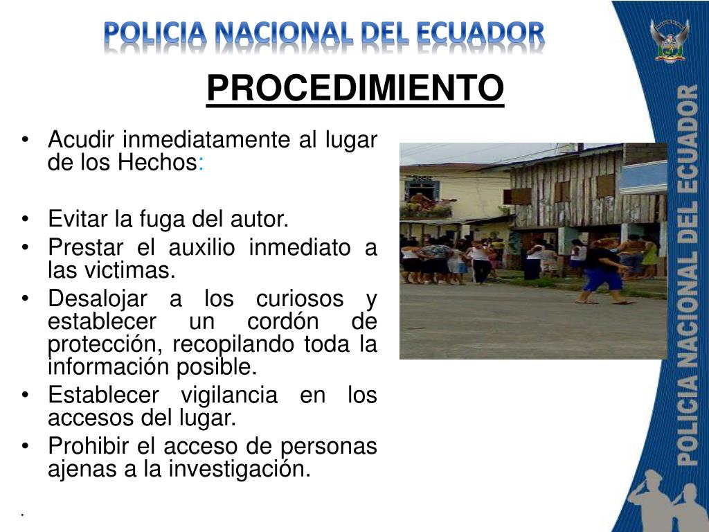 POLICIA NACIONAL DEL ECUADOR PROCEDIMIENTO • Acudir inmediatamente al lugar de los Hechos: • Evitar la fuga del autor. • Prestar el auxilio inmediato a las victimas. • Desalojar a los curiosos y establecer un cordón de protección, recopilando toda la información posible. • Establecer vigilancia en los accesos del lugar. • Prohibir el acceso de personas ajenas a la investigación.