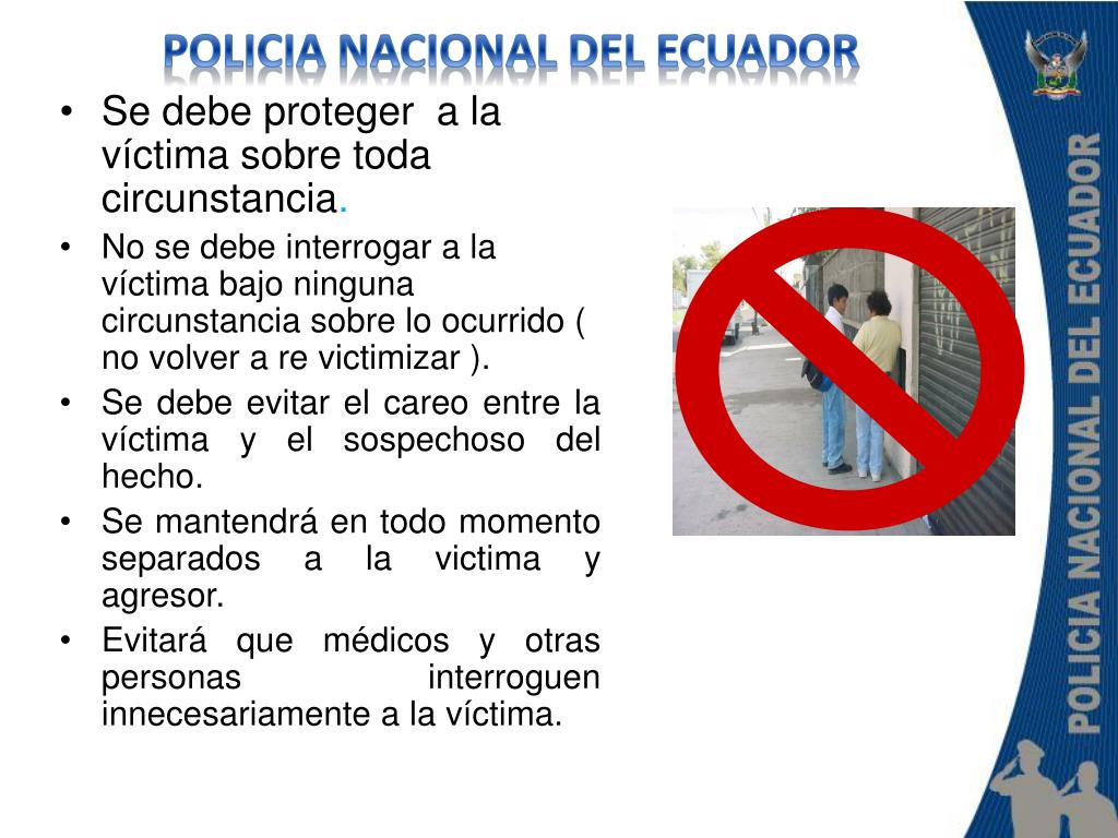 POLICIA NACIONAL DEL ECUADOR • Se debe proteger a la víctima sobre toda circunstancia. • No se debe interrogar a la víctima bajo ninguna circunstancia sobre lo ocurrido ( no volver a re victimizar ). • Se debe evitar el careo entre la víctima y el sospechoso del hecho. • Se mantendrá en todo momento separados a la victima y agresor. • Evitará que médicos y otras personas interroguen innecesariamente a la víctima.