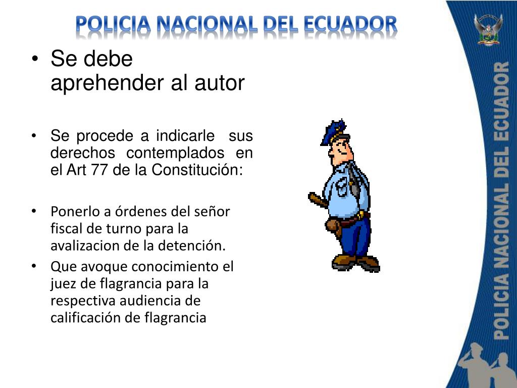 POLICIA NACIONAL DEL ECUADOR • Se debe aprehender al autor • Se procede a indicarle sus derechos contemplados en el Art 77 de la Constitución: • Ponerlo a órdenes del señor fiscal de turno para la avalizacion de la detención. • Que avoque conocimiento el juez de flagrancia para la respectiva audiencia de calificación de flagrancia