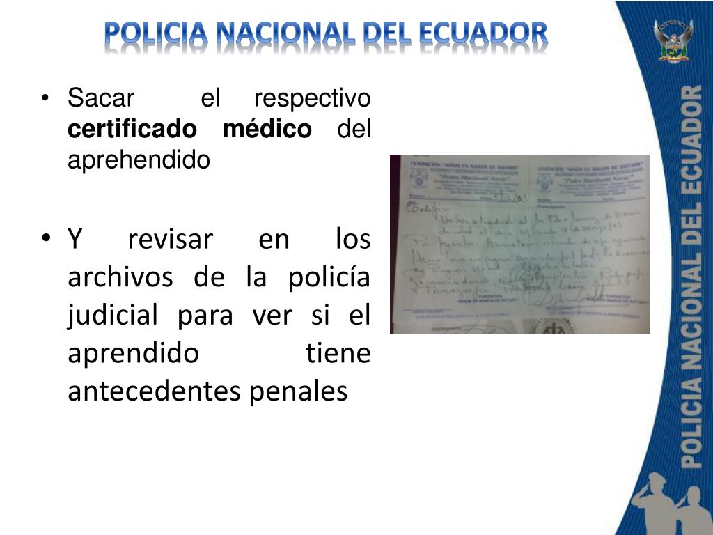 POLICIA NACIONAL DEL ECUADOR • Sacar el respectivo certificado médico del aprehendido • Y revisar en los archivos de la policía judicial para ver si el aprendido tiene antecedentes penales