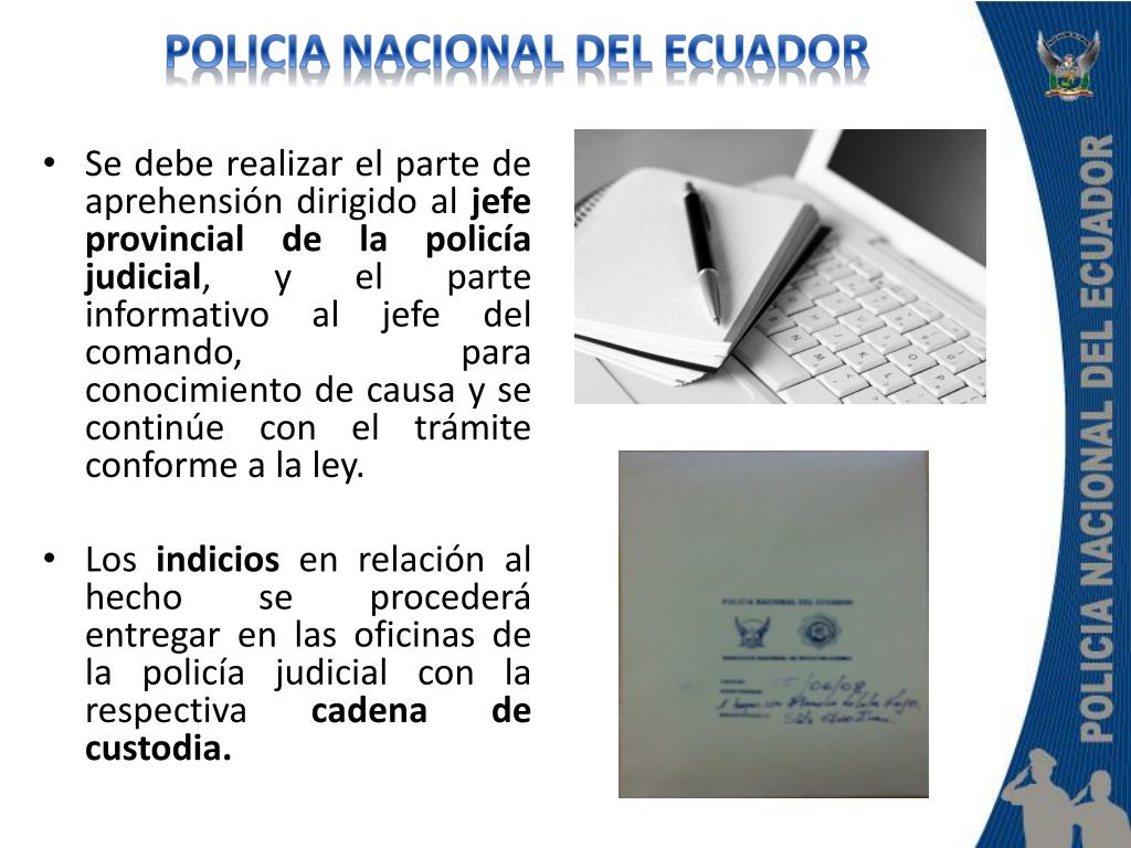 POLICIA NACIONAL DEL ECUADOR • Se debe realizar el parte de aprehensión dirigido al jefe provincial de la policía judicial, y el parte informativo al jefe del comando, para conocimiento de causa y se continúe con el trámite conforme a la ley. • Los indicios en relación al hecho se procederá entregar en las oficinas de la policía judicial con la respectiva cadena de custodia.