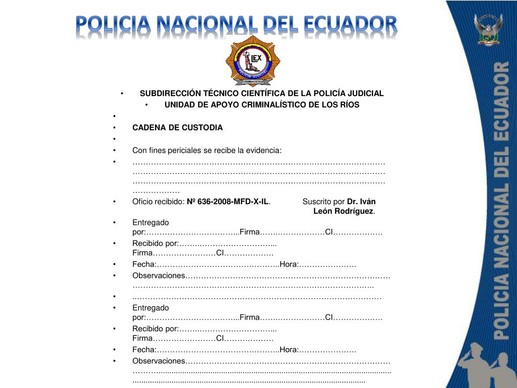 POLICIA NACIONAL DEL ECUADOR • SUBDIRECCIÓN TÉCNICO CIENTÍFICA DE LA POLICÍA JUDICIAL • UNIDAD DE APOYO CRIMINALÍSTICO DE LOS RÍOS • CADENA DE CUSTODIA • Con fines periciales se recibe la evidencia: • ……………………………………………………………………………………………………………………………………………………………………………………………………………………………………………………………………………… • Oficio recibido: Nº 636-2008-MFD-X-IL. Suscrito por Dr. Iván León Rodríguez. • Entregado por:……………………………...Firma…….………………CI………………. • Recibido por:……..………………………... Firma……………………CI………………. • Fecha:………………………………………..Hora:…………………. • Observaciones…………………………………………………………………………………………………………………………………………………….. • ..………………………………………………………………………………… • Entregado por:……………………………...Firma…….………………CI………………. • Recibido por:……..………………………... Firma……………………CI………………. • Fecha:………………………………………..Hora:…………………. • Observaciones…………………………………………………………………………….........................................................................................................................................................................................................................