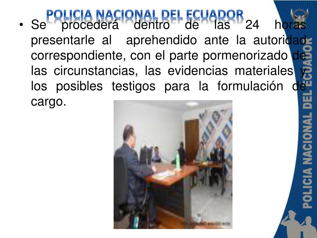 POLICIA NACIONAL DEL ECUADOR • Se procederá dentro de las 24 horas presentarle al aprehendido ante la autoridad correspondiente, con el parte pormenorizado de las circunstancias, las evidencias materiales y los posibles testigos para la formulación de cargo.