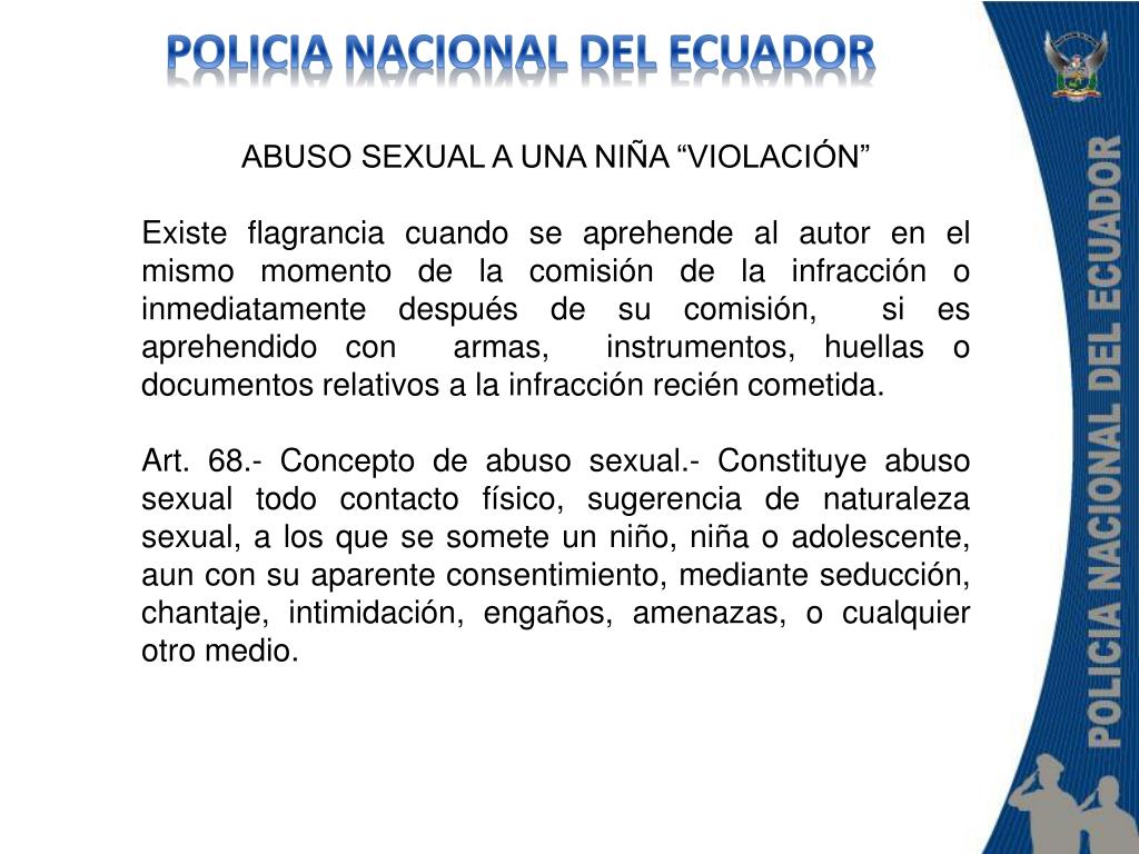 POLICIA NACIONAL DEL ECUADOR ABUSO SEXUAL A UNA NIÑA “VIOLACIÓN” • Existe flagrancia cuando se aprehende al autor en el mismo momento de la comisión de la infracción o inmediatamente después de su comisión, si es aprehendido con armas, instrumentos, huellas o documentos relativos a la infracción recién cometida. • Art. 68.- Concepto de abuso sexual.- Constituye abuso sexual todo contacto físico, sugerencia de naturaleza sexual, a los que se somete un niño, niña o adolescente, aun con su aparente consentimiento, mediante seducción, chantaje, intimidación, engaños, amenazas, o cualquier otro medio.