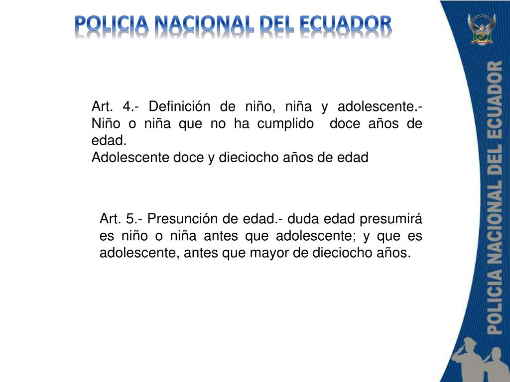 POLICIA NACIONAL DEL ECUADOR • Art. 4.- Definición de niño, niña y adolescente.- Niño o niña que no ha cumplido doce años de edad. • Adolescente doce y dieciocho años de edad • Art. 5.- Presunción de edad.- duda edad presumirá es niño o niña antes que adolescente; y que es adolescente, antes que mayor de dieciocho años.
