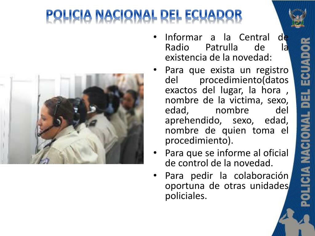 POLICIA NACIONAL DEL ECUADOR • Informar a la Central de Radio Patrulla de la existencia de la novedad: • Para que exista un registro del procedimiento(datos exactos del lugar, la hora , nombre de la victima, sexo, edad, nombre del aprehendido, sexo, edad, nombre de quien toma el procedimiento). • Para que se informe al oficial de control de la novedad. • Para pedir la colaboración oportuna de otras unidades policiales.